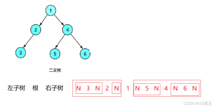 中序遍历(Inorder Traversal)——左子树、根、右子树。空用N表示。