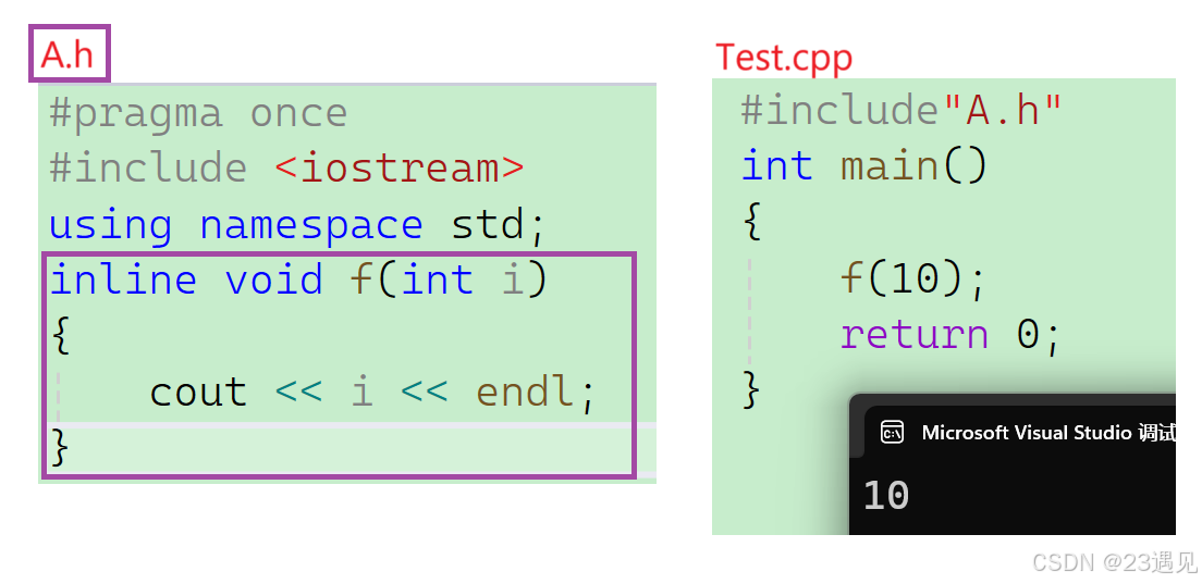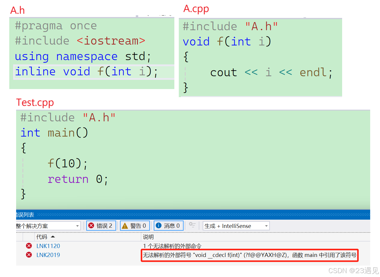 inline不建议声明和定义分离到两个文件,分离会导致链接错误。因为inline被展开,就没有函数地址,链接时会出现报错。
