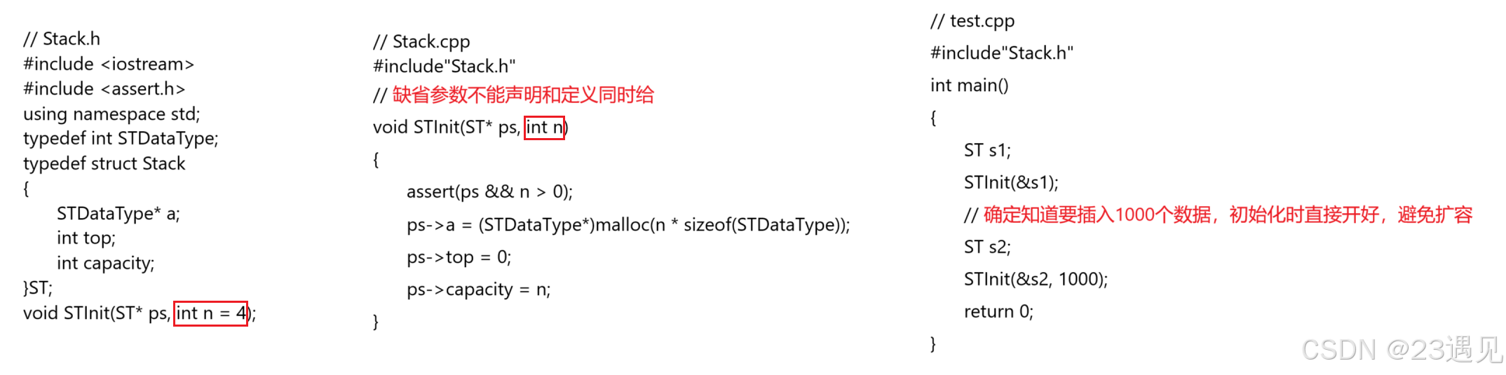 }函数声明和定义分离时,缺省参数不能在函数声明和定义中同时出现,规定必须函数声明给缺省值。