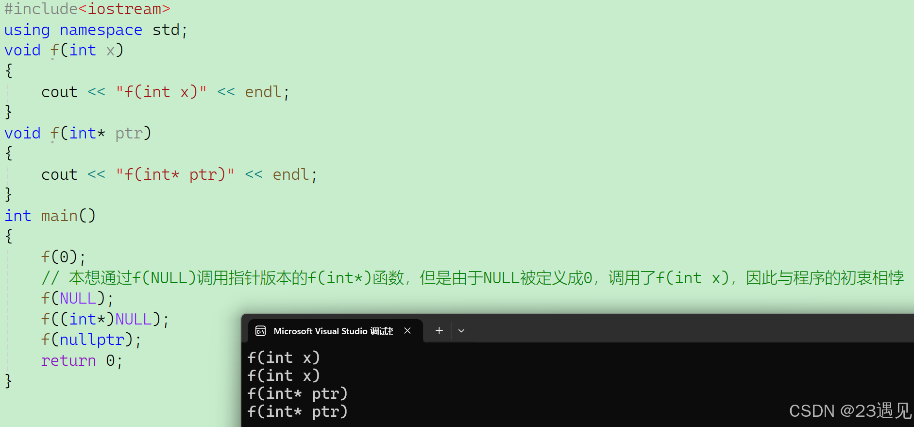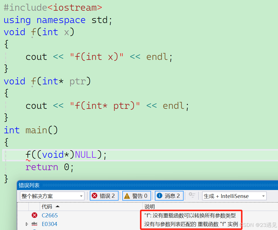 C++中NULL可能被定义为字面常量0,或者C中被定义为无类型指针(void*)的常量。不论采取何种定义,在使用空值的指针时,都不可避免的会遇到一些麻烦,本想通过f(NULL)调用指针版本的f(int*)函数,但是由于NULL被定义成0,调用了f(int x),因此与程序的初衷相悖。f((void*)NULL); 调用会报错。