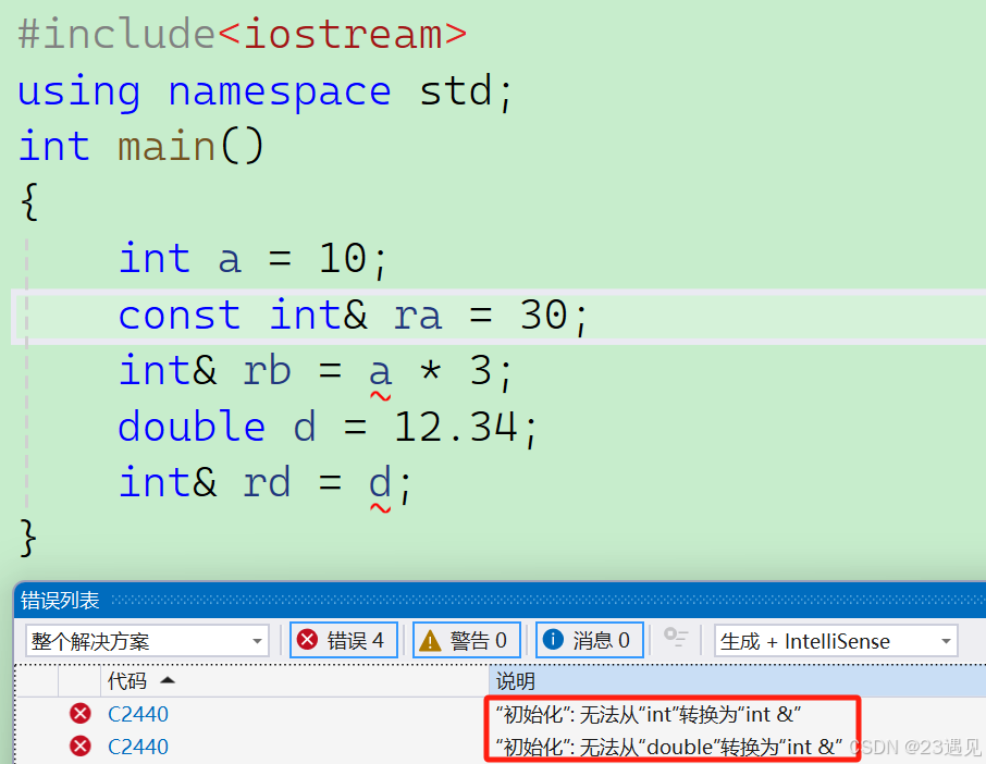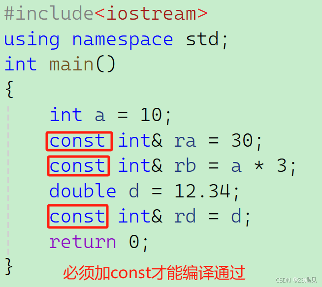 }需要注意的是类似int& rb = a*3; double d = 12.34; int& rd = d; 这样一些场景下a*3的和结果保存在一个临时对象中,int& rd = d也是类似,在类型转换中会产生临时对象存储中间值,也就是rb和rd引用的都是临时对象,而C++规定临时对象具有常性,所以这里就触发了权限放大,必须要用常引用才可以。
