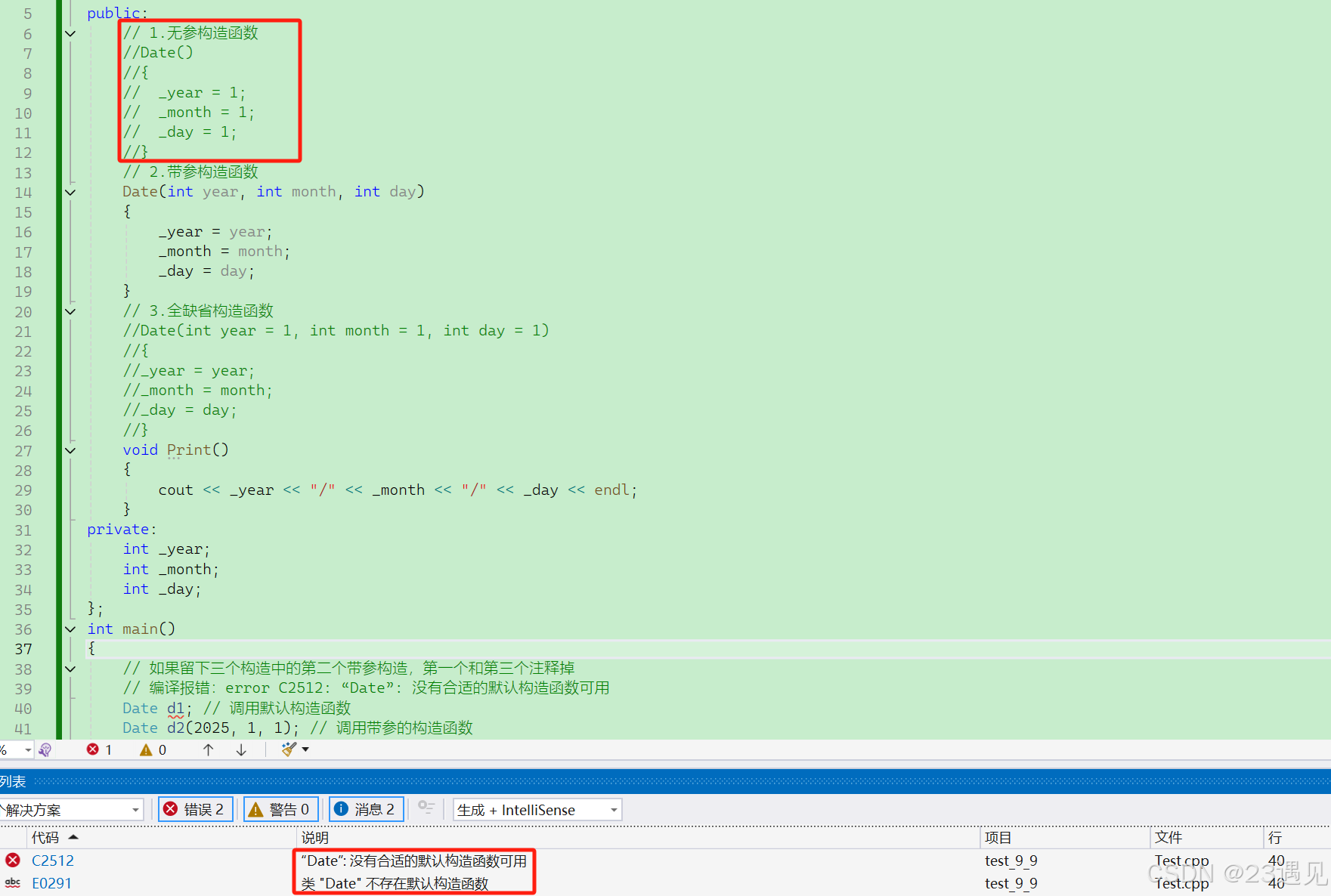 // 编译报错:error C2512: “Date”: 没有合适的默认构造函数可用