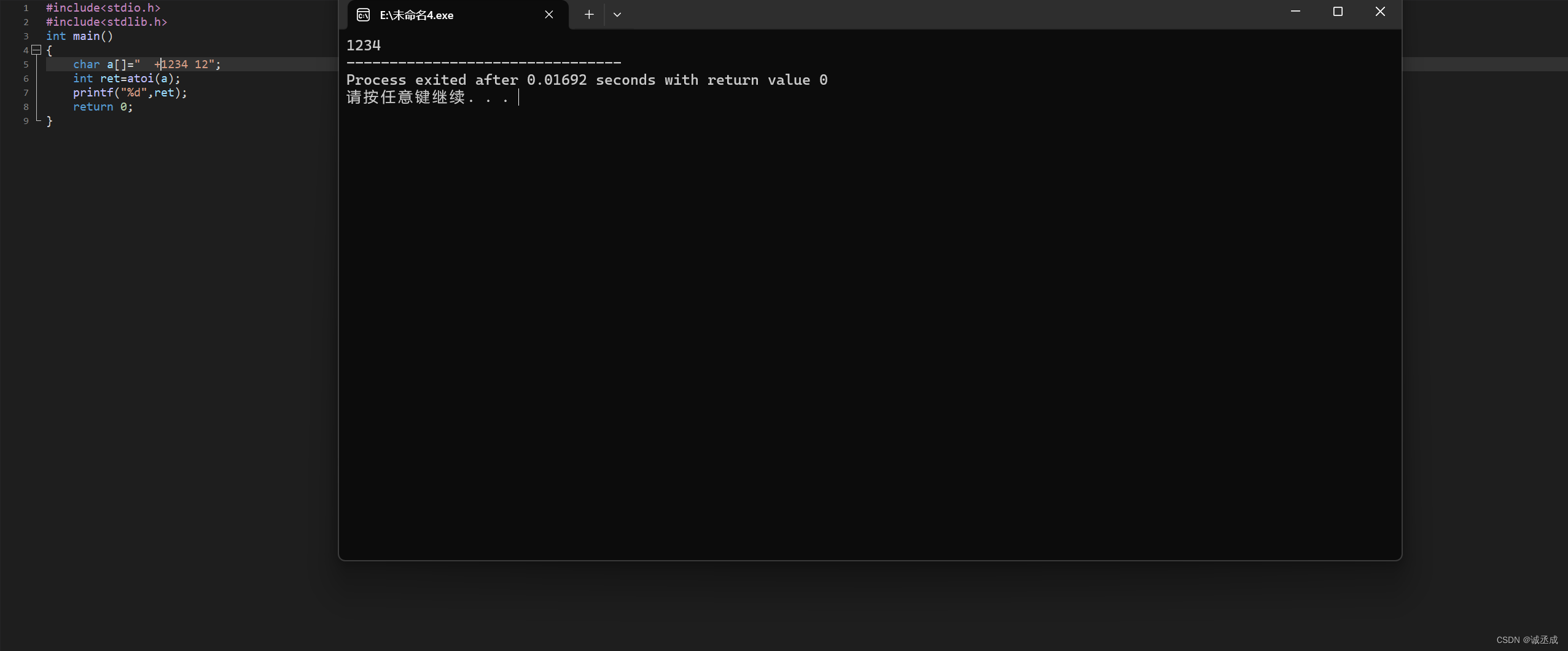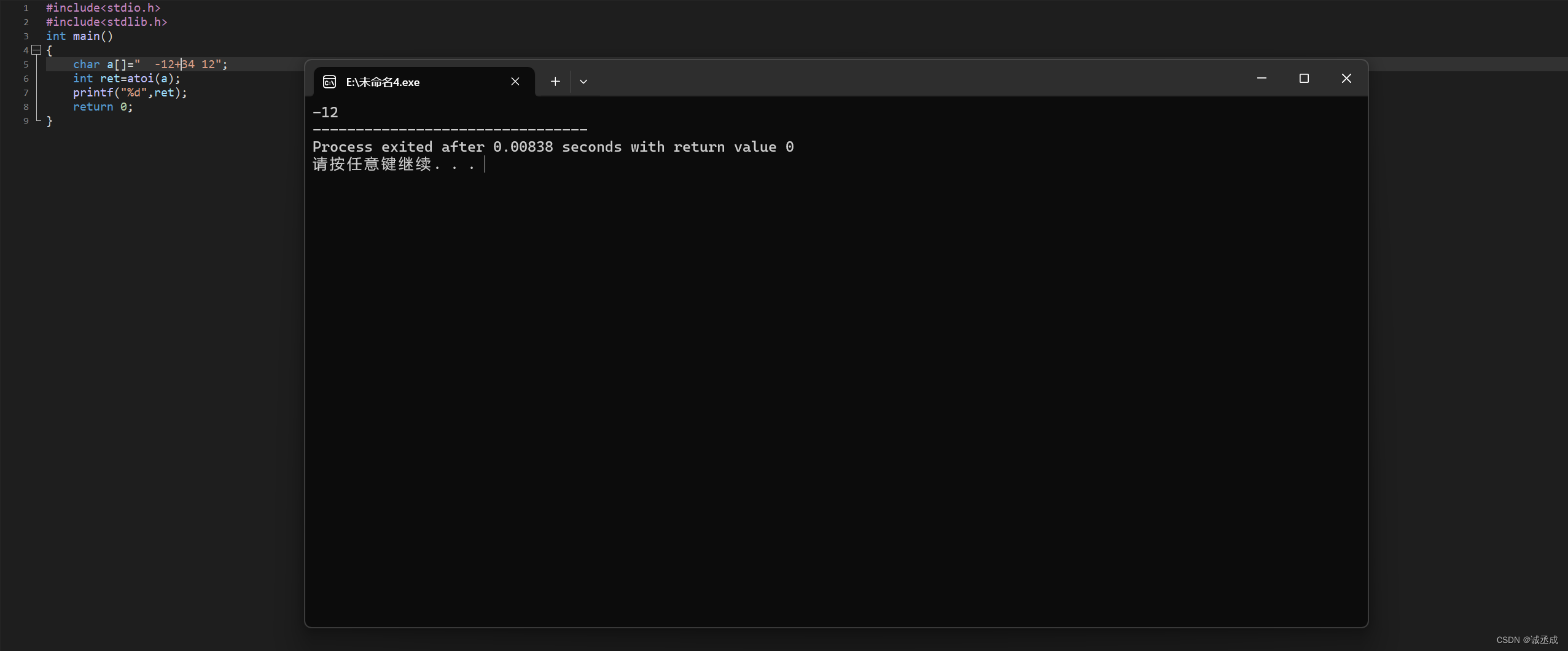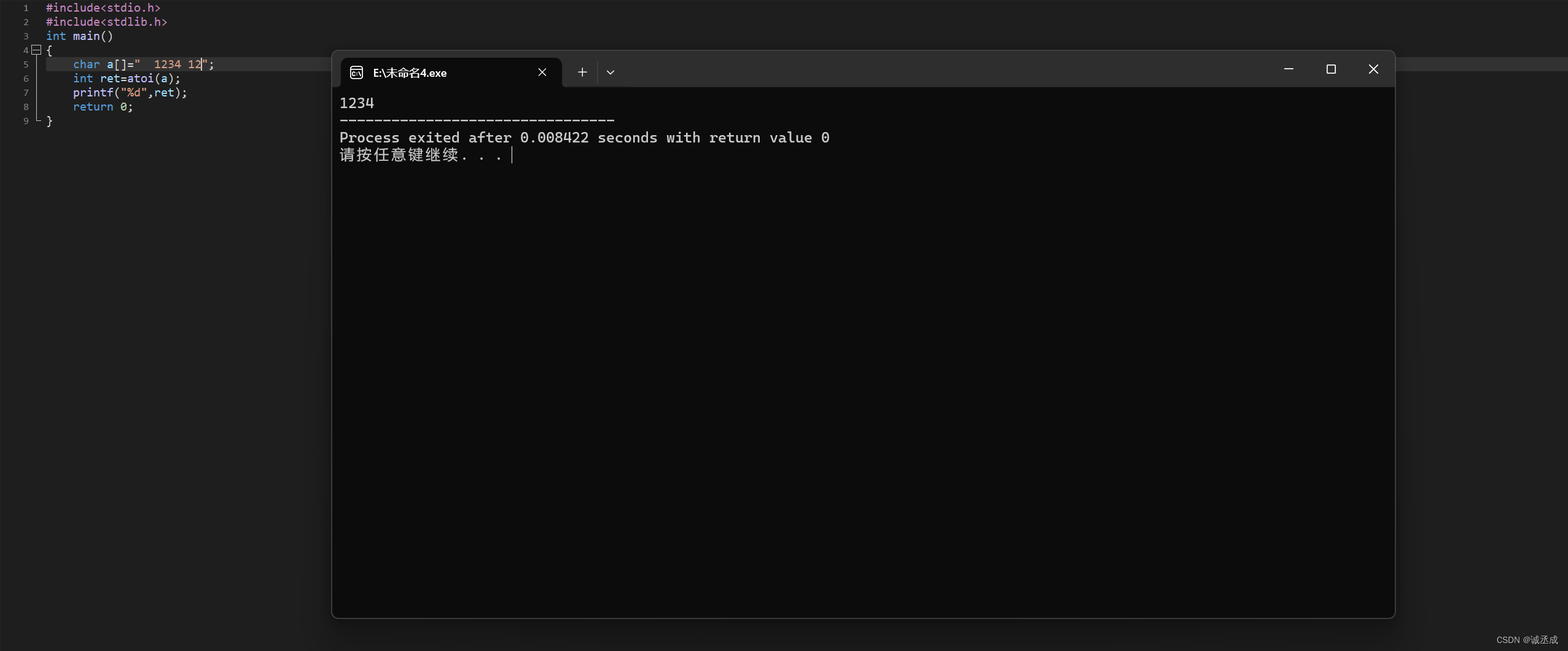 #include<stdio.h> #include<stdlib.h> int main() { char a[]="123412"; int ret=atoi(a); printf("%d",ret); return 0; }