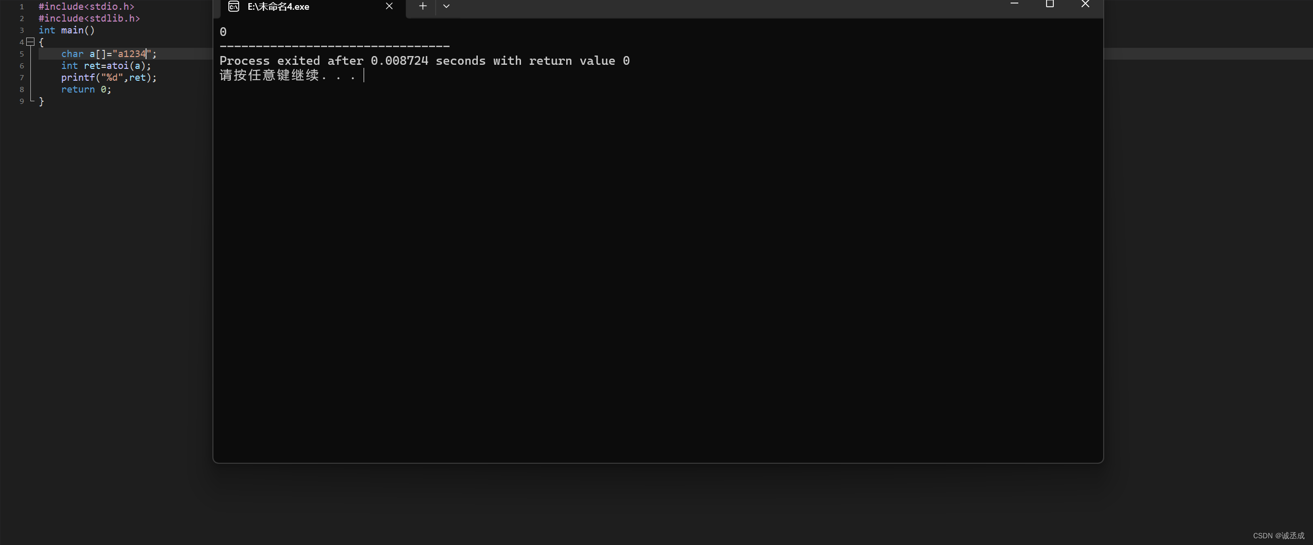 例如一个字符串ch="a1234",那么atoi第一次检索时没有直接遇到数字,而是遇到了字母,那么就会返回0,如图。