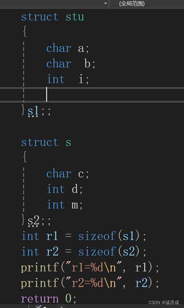 在结构体s2中,char c位于与结构体变量偏移量为1的位置,占1个字节,之后是int d,由于此时偏移量为1,1不是4的倍数,因此需再往后偏倚3个字节再存储d,此时偏移量为8,是4的倍数,则可以直接存储int m,此时总偏移量为12,是最大对其数4的整数倍,因此s2的内存大小为12个字节。