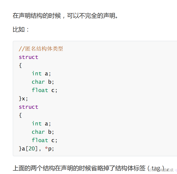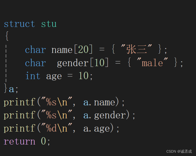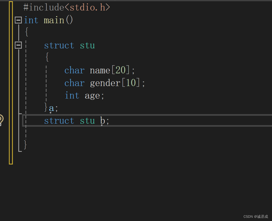 在这里我们定义了一个结构体,它的类型为stu,变量名为a,如果不在末尾加一个变量名,那么就表示名为stu的结构体的声明。