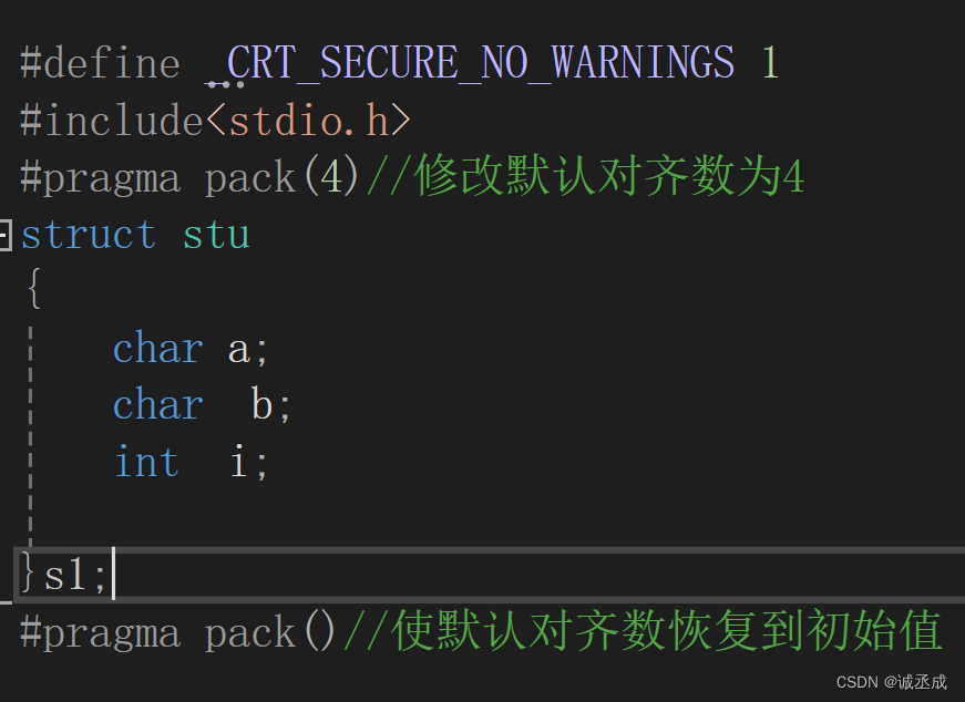 上面我们提到VS的默认对齐数为8,那么如何修改系统的默认对齐数呢?可以使用#pragma pack(),括号内填需要修改的对齐数,示例如下。