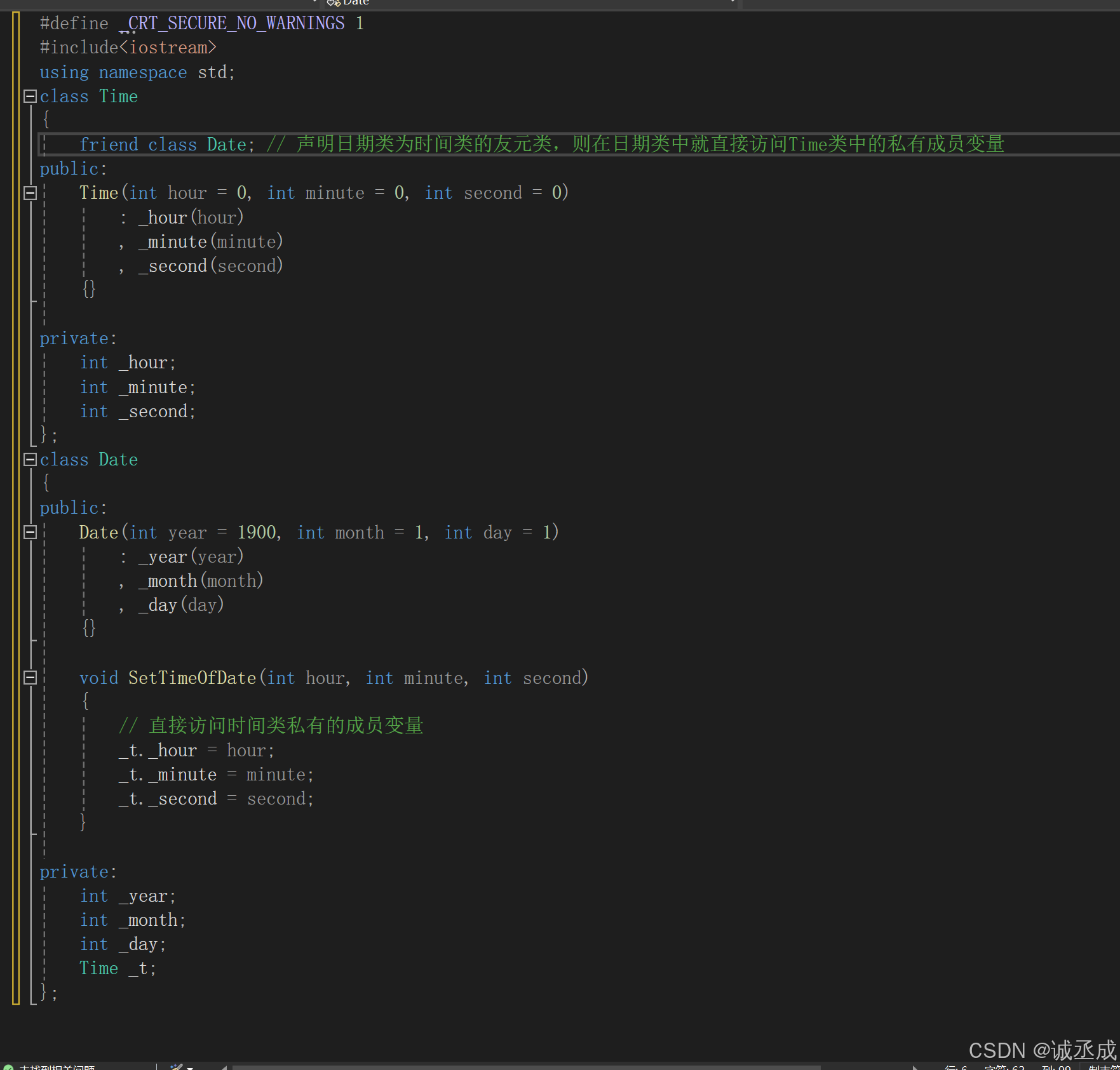 比如上述Time类和Date类,在Time类中声明Date类为其友元类,那么可以在Date类中直接访问Time 类的私有成员变量,但想在Time类中访问Date类中私有的成员变量则不行。