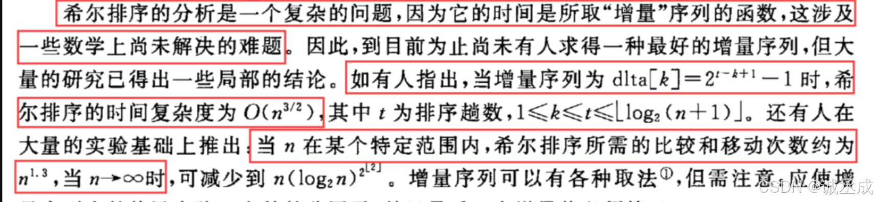 希尔排序时间复杂度不好计算,因为 gap 的取值很多,导致很难去计算,因此很多书中给出的希尔排序的时间复杂度都不固定。《数据结构(C语⾔版)》—严蔚敏书中给出的时间复杂度为: