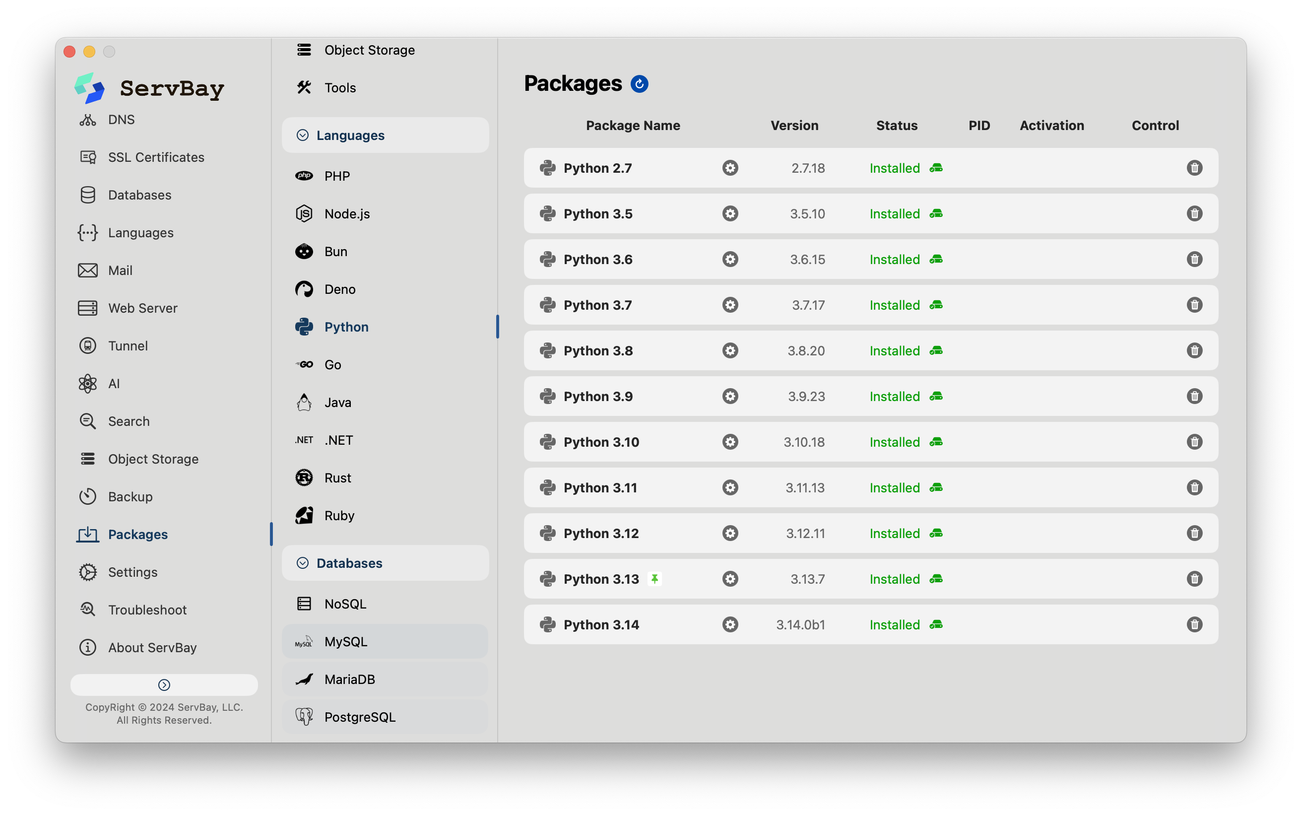 例如,ServBay 支持一键安装和管理多种语言(Golang, Node.js, Python等)的不同版本,并允许它们同时运行。这为开发者和测试人员提供了一个高效的方式来模拟复杂的生产依赖,从而在合并前彻底检验AI代码的兼容性和集成效果。