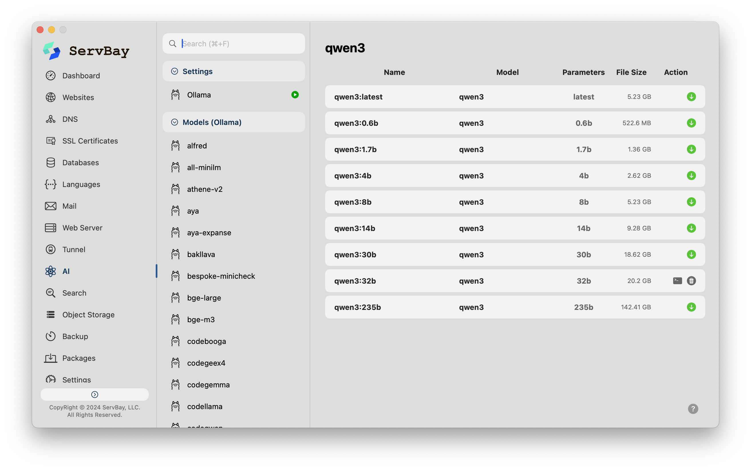 随着AI 编程助手的越来越多,越来越给力,软件开发中使用AI的门槛已几乎消失。相信也有一些团队会在本地部署AI模型。这样不仅可以避免公共API的延迟和数据隐私问题,通过像 ServBay 这样的工具,开发者点击一下,就能在本地机器上搭建起一个完整的AI环境,直接生成代码。