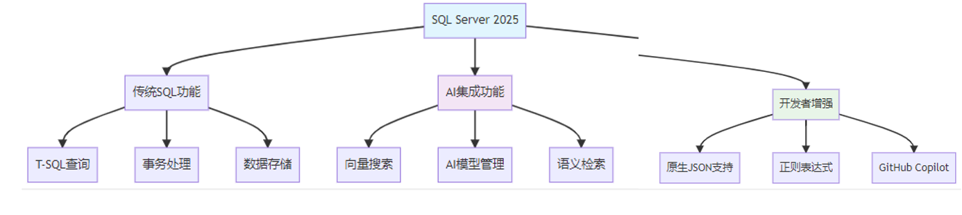 上图清晰地展示了SQL Server 2025的整体架构演进。传统的SQL功能依然稳如泰山,但新增的AI集成功能和开发者增强特性让这个数据库彻底"进化"了。这种架构设计的妙处在于:既保持了向后兼容性,又为未来的智能化应用打下了坚实基础。
