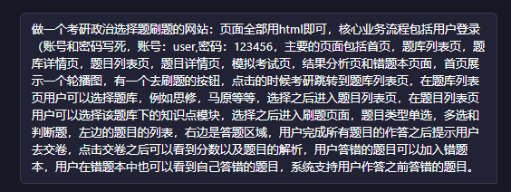 哈喽小伙伴们大家好,我是小李,最近不是快到考研初试了嘛。我寻思让AI帮我做一款选择题的刷题网站,来帮助备考的小伙伴们快速复习知识点,来达到考前的冲刺。同时也借此机会来锻炼一下自己提示词和架构设计的能力。说干就干!