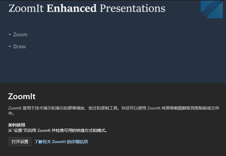 ZoomIt:ZoomIt 是用于技术演示和演示的屏幕缩放、批注和录制工具。 还可以使用 ZoomIt 将屏幕截图截取到剪贴板或文件。 ZoomIt 在托盘中静默运行,通过可自定义的热键激活,可放大屏幕区域,缩放后可以在区域内移动,并在放大的图像上进行绘制。
