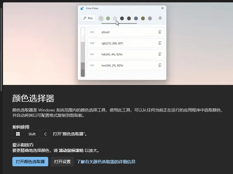 颜色拾取器:只需要按快捷键 Windows 键+Shift+C 键,就可以快速拾取电脑屏幕任意地方选取颜色,并以可配置格式将其复制到剪贴板。