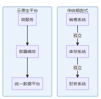 过去的 IT 架构就像一座座孤立的烟囱,各部门自建系统,互不兼容。现在的趋势是向云原生架构演进,统一资源调度,支持弹性扩展。