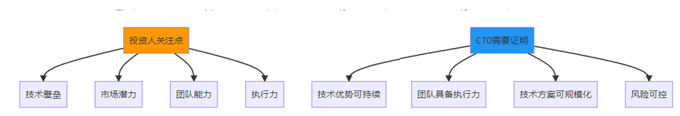这张图展示了投资人关注点与CTO需要证明的内容之间的对应关系。优秀的CTO需要具备"翻译"能力,将技术优势转化为投资人能理解的商业逻辑。