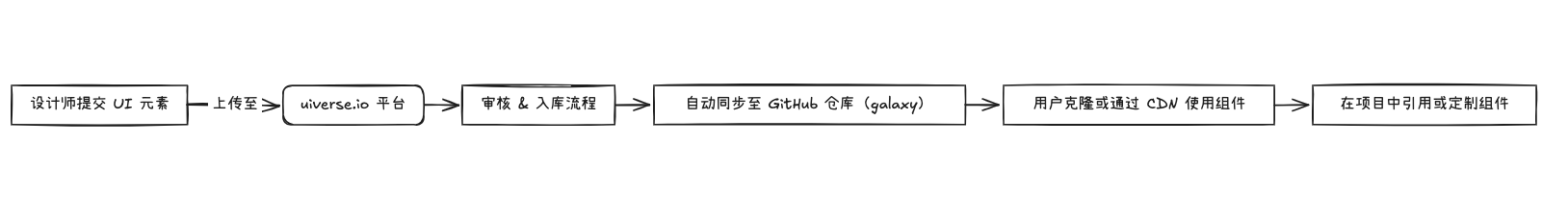 素材提交 &审核 | 设计师在 uiverse 平台上传 UI 元素 → 平台审核 → 自动同步至 GitHub。 | 统一入口、质量把控、社区驱动,保障生态稳定。 |