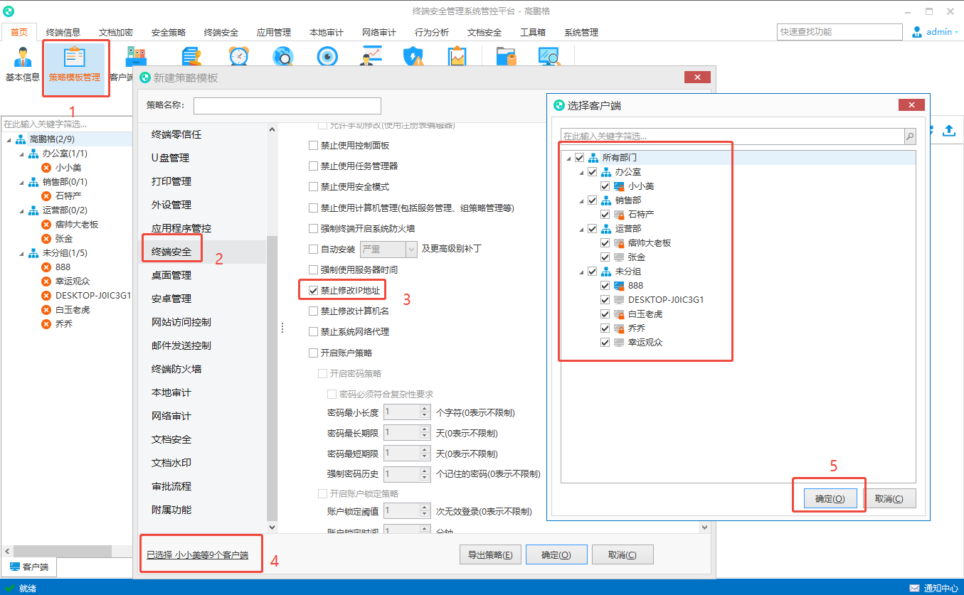 设置非常简单,只需要在管理后台打开策略模板管理,找到终端安全选项,勾选"禁止修改IP地址"选项,,选择要实施该策略的客户端,点击确定,系统就会自动锁定所选终端的IP地址,无需额外操作。