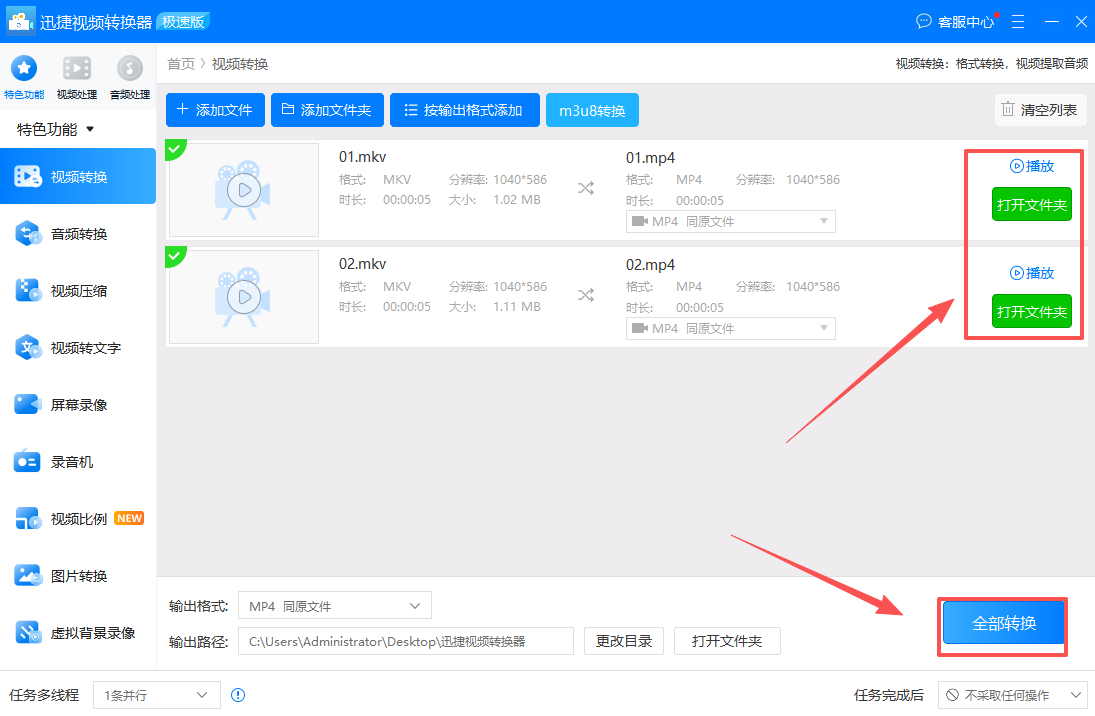 最后点击【全部转换】按钮,就能完成视频格式转换!可以在指定的文件夹中找到转换成功的MP4视频,打开就能直接播放。