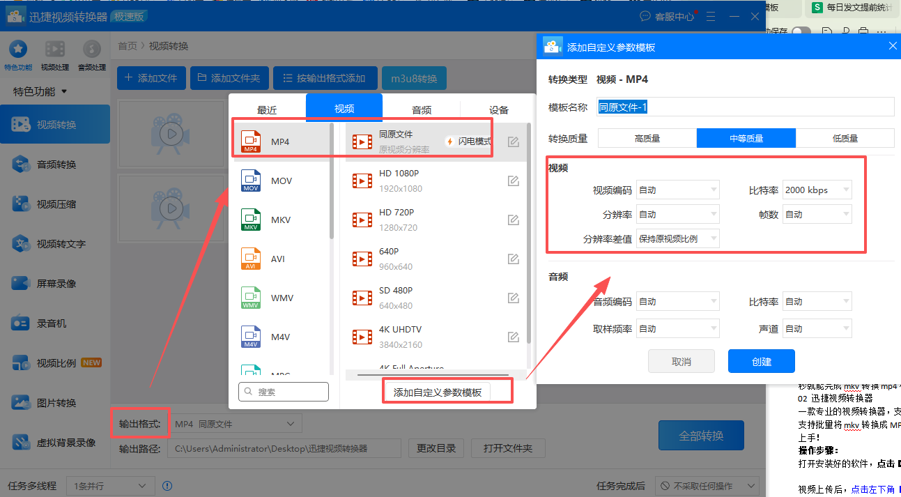 视频上传后,点击左下角【输出格式】设置视频格式为MP4、画质与原来的视频文件相同;还可以自定义设置视频输出的画质参数;