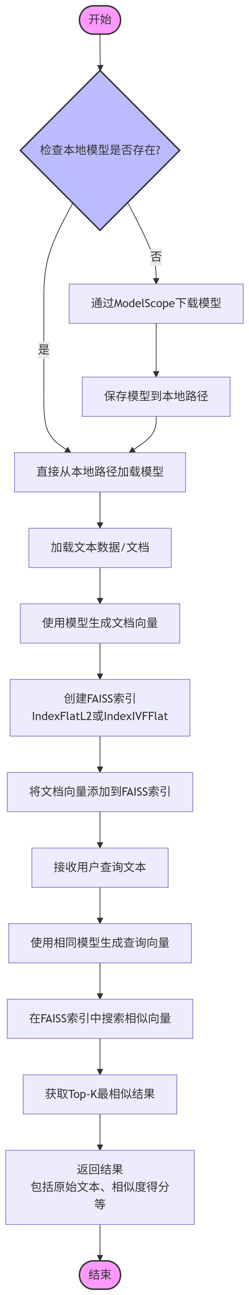 相似度分数: [[0.9999999 0.5719301 0.16580734 0.00947747]]先判断本地是否存在模型是否存在,存在就直接加载,不存在则通过modelscope下载到本地,然后生成文档向量,创建FAISS索引,进行查找,最后返回结果;