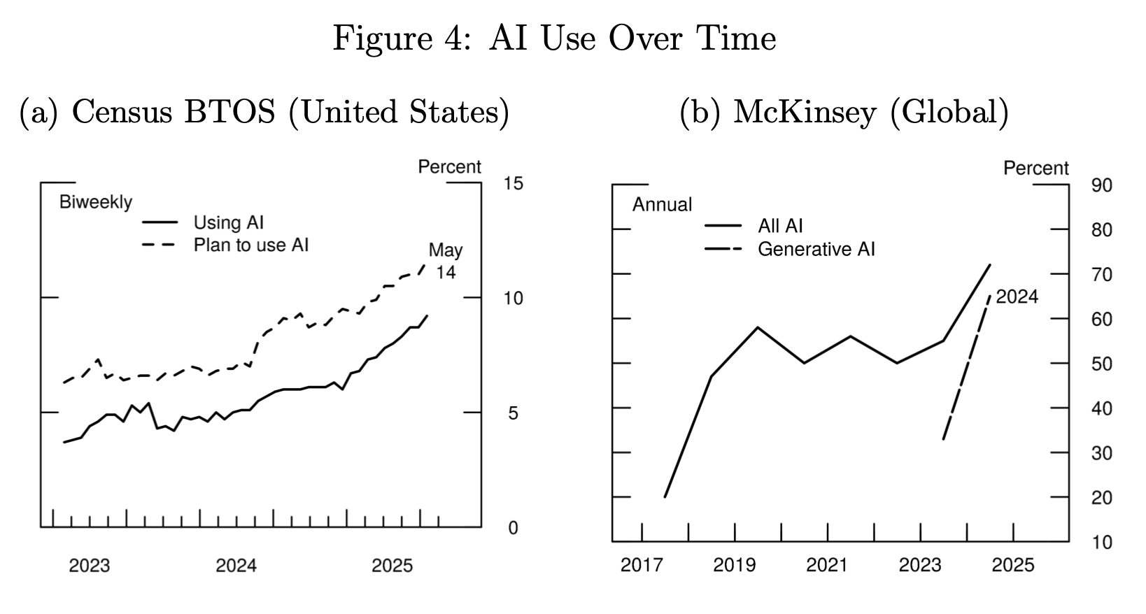 首先,审视其扩散程度,我们看到了一个复杂且不均衡的画面。一方面,企业层面的采用呈现明显分化。麦肯锡等机构的调查显示,大型企业中的采用率激增,而美国人口普查局的BTOS调查则表明,在更广泛的经济体中,尤其是在小企业中,采用率仍然相当低。这揭示了一个关键的扩散障碍:大型企业拥有数据、资本和技术能力来部署模型,而小企业则面临更高门槛。