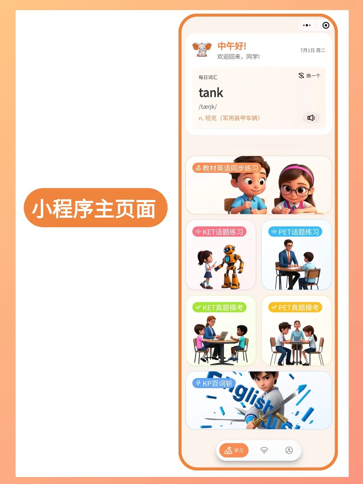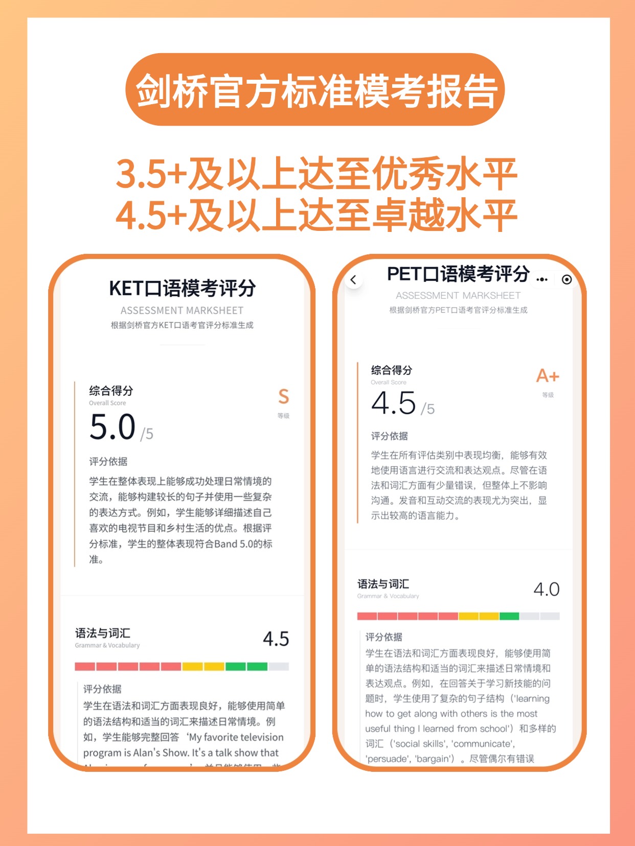 飞象说口语无需用户单独切换 “KET 模式” 或 “PET 模式”,通过以下设计实现双考试覆盖: