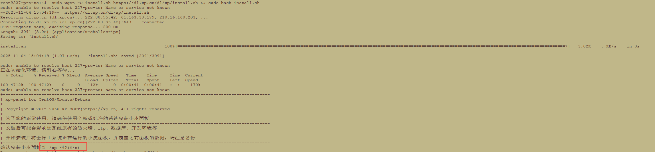 执行安装命令后,等待小皮面板初始安装环境,然后输入 y,确认安装。