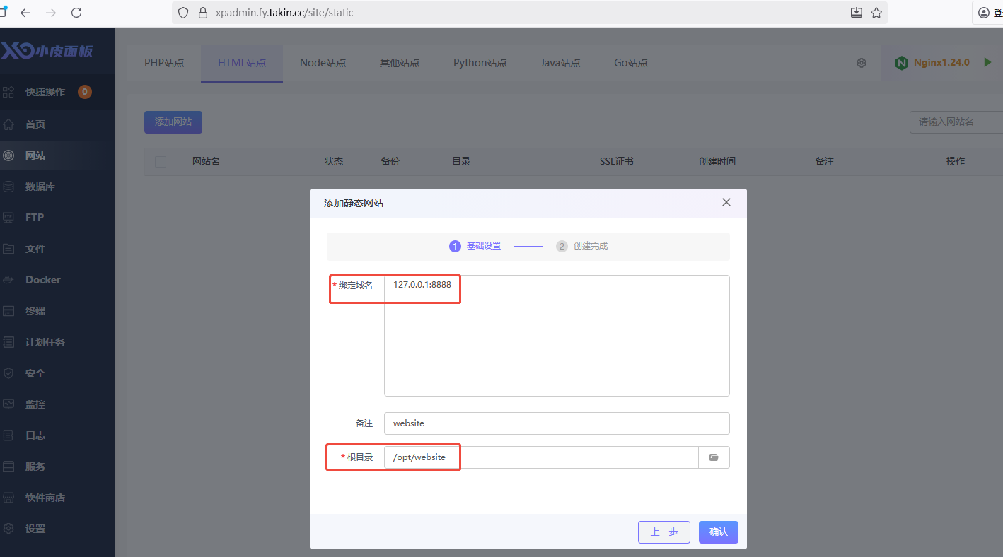1.在小皮面板中部署一个 HTML 站点, 站点目录为 /opt/website