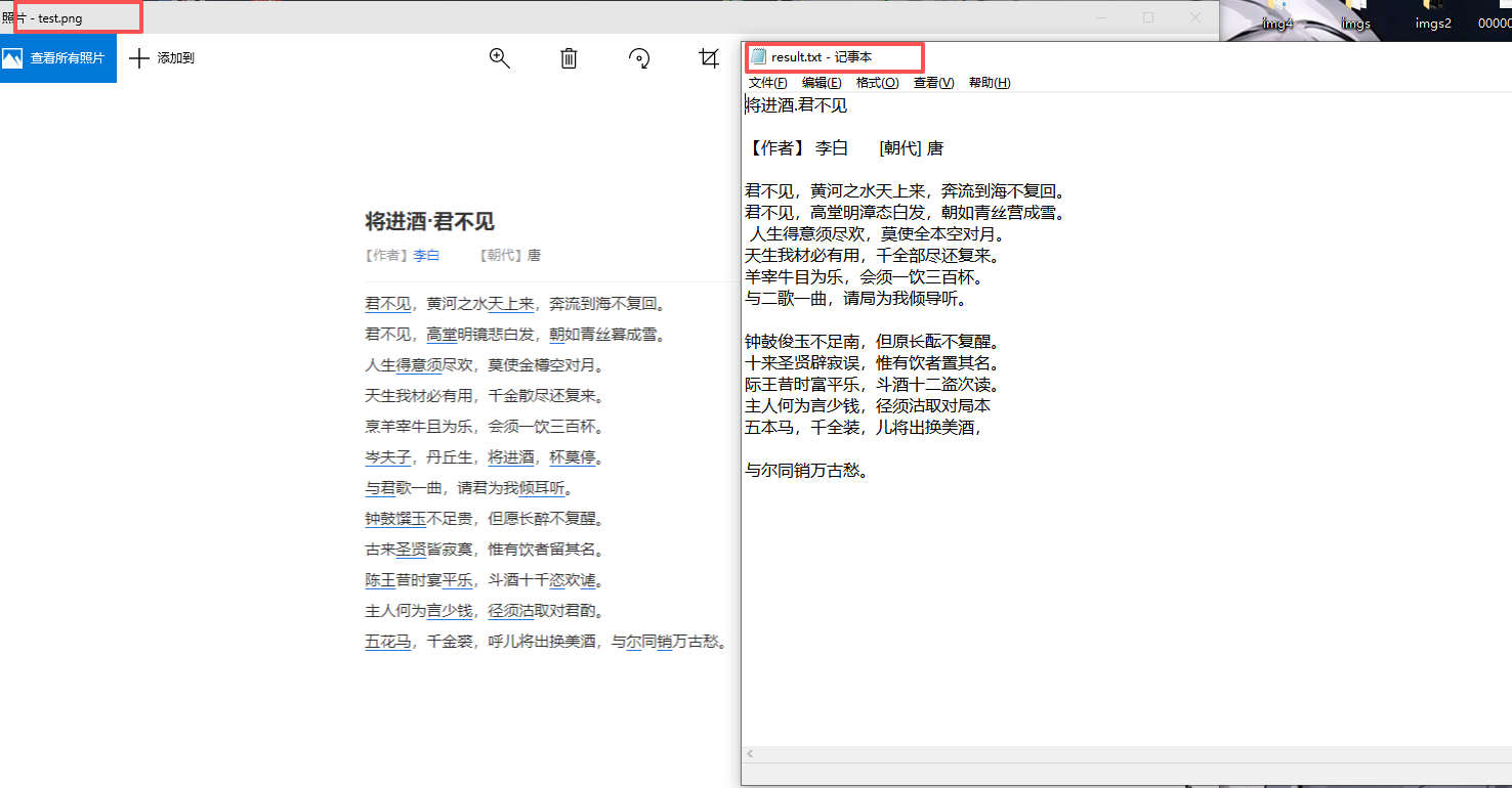 运行,在图片文件夹下会生成一个result.txt文件,里面会有识别结果