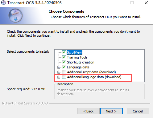 由于网络的原因,可能出现添加到语言包下载失败的情况,点击确定继续,先把ocr安装好,后续再去网上下载最新的语言包放到\tessdata文件夹下即可