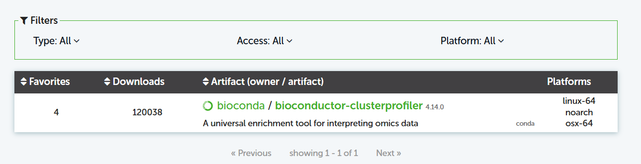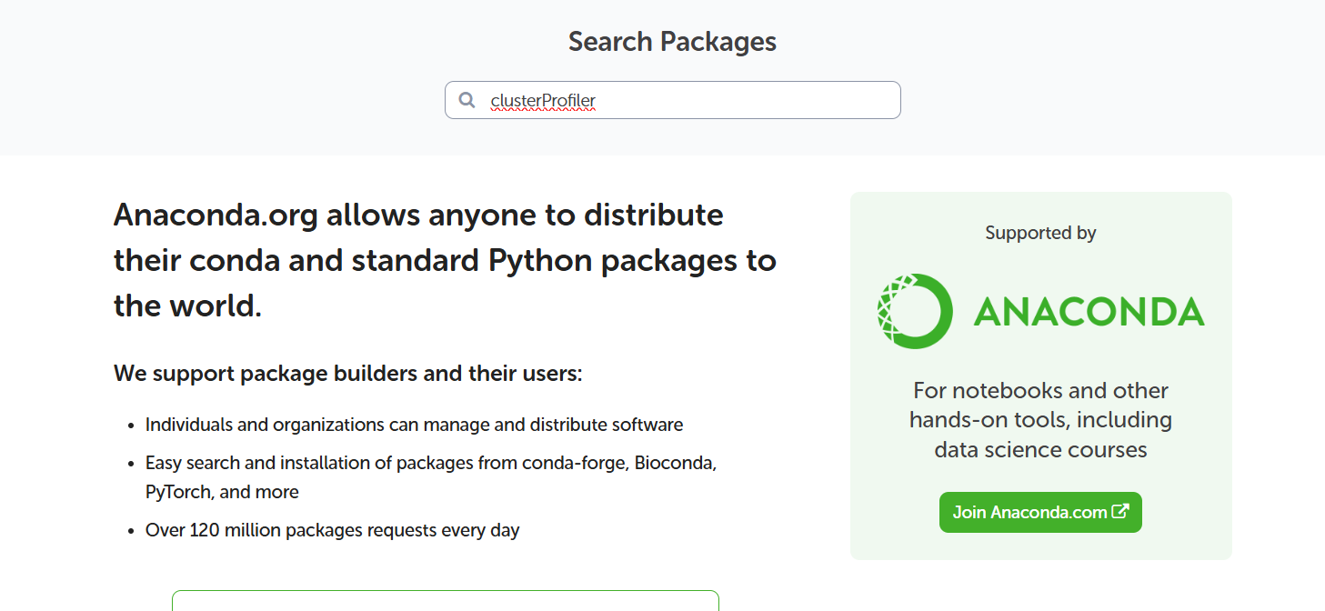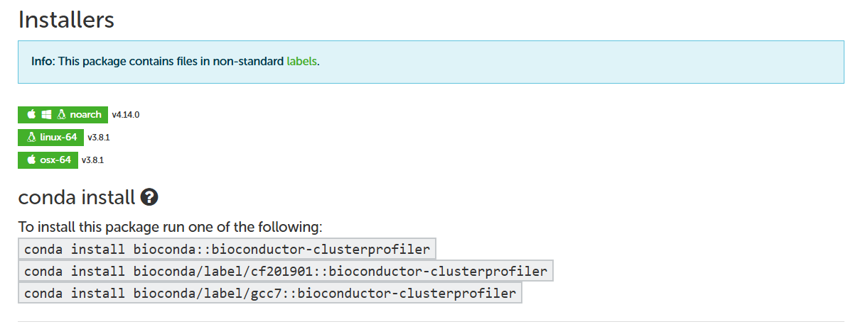 我们此时学习一些软件及包的安装,这里以R包clusterProfiler为例,我们在https://anaconda.org/中搜索包的名字,点击进入。我们可以使用这里的任意命令输入到终端安装,例如