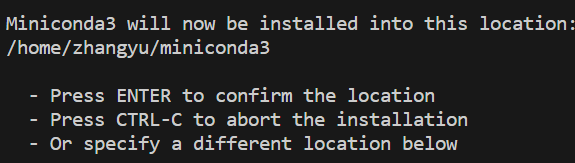 来启动安装程序。根据提示按下回车,之后一直按下回车到输入yes,之后输入你的目的安装目录(注意要求是没有存在的路径,例如你想在/path/安装,请输入/path/conda,它会自动新建路径)。最后一直根据指示输入yes就可以。