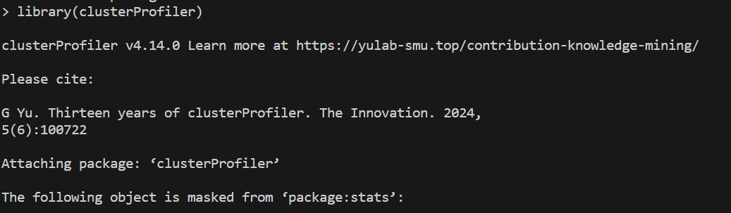 这样,我们就在R中安装好了这个包。我们在终端输入R打开R,加载这个包试一试:library(clusterProfiler)。