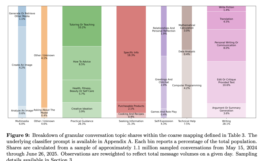 现在ChatGPT的使用场景里,查询信息和写作辅助占了大多数。比如三分之二的写作需求是修改润色,而不是从头写。编程相关的请求只占4%,这可能打脸了之前说程序员最依赖AI的说法。