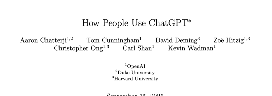 2025年9月15日,一份由Open AI、杜克大学与哈佛大学研究人员联合发布的重磅报告-《How People Use ChatGPT》首次通过其内部数据,为我们揭开这层神秘的面纱。这份报告显示,全球有超过7亿人每周都在用ChatGPT聊天。这东西从2022年出来到现在,短短三年就这么多用户,而且很多人一周能发近200亿条消息。研究人员用了新技术分析海量对话,发现了一些有意思的数据。