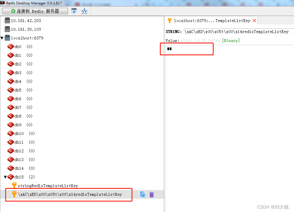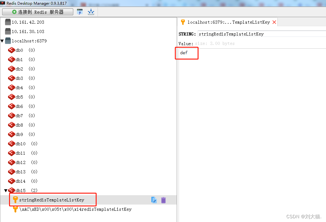可以发现stringRedisTemplate存入的还是字符串样式,能直接看出属性值为def,<font color='red'>然而RedisTemplate存入的key值前面居然多加了一串16进制的字符串值,同时存入redis的结果也是转换为字节数组bytes之后的看不懂的值</font>。