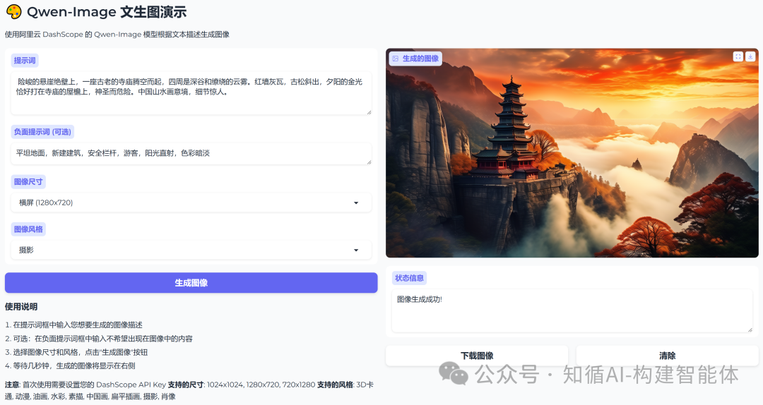 经过今天的部署,我们能构建了一个功能完整、用户友好的Web应用程序,通过Gradio界面连接Qwen-Image模型实现了从文本描述生成高质量图像的功能。使用前务必将 DASHSCOPE_API_KEY 替换为阿里云平台获取的真实密钥。