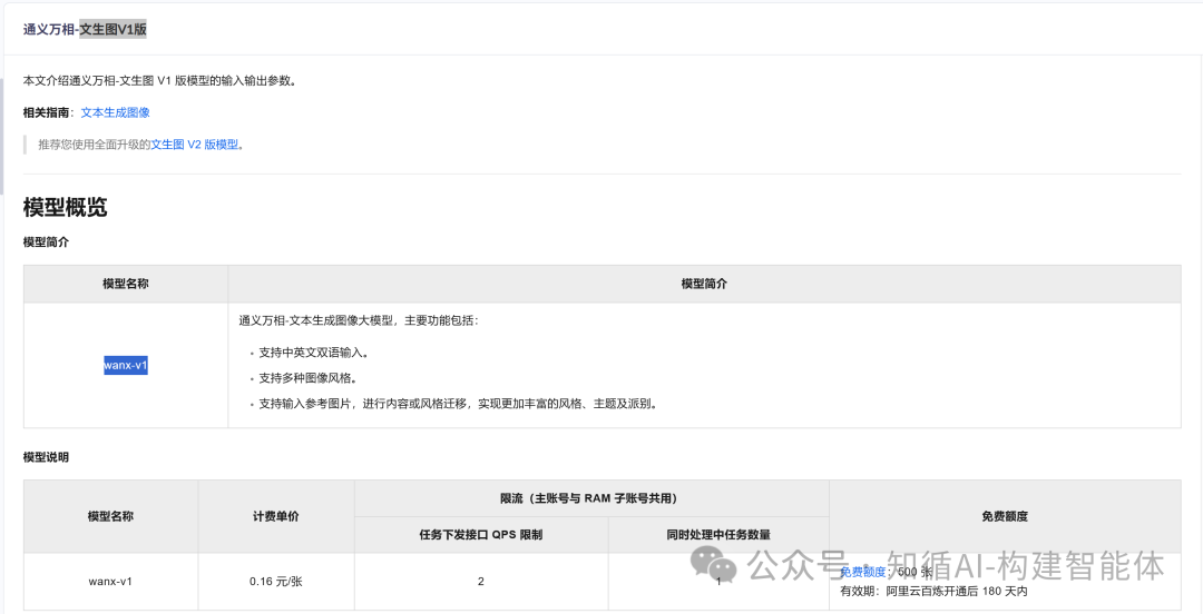 模型使用的是文生图V1版(wanx-v1),是最早期的版本,但它的丰富性足以够我们多场景、多风格、多尺寸的演示,可以根据实际需求切换更新的模型版本,下图是V1版的官网介绍: