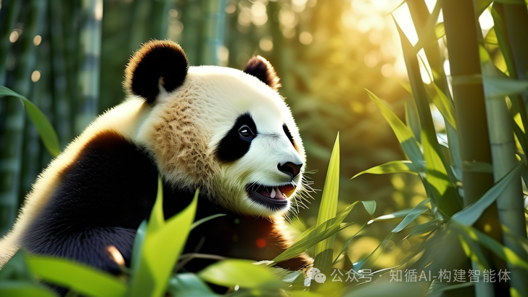 3.示例提示词:一只可爱的熊猫在竹林里吃竹子,阳光透过竹叶洒下