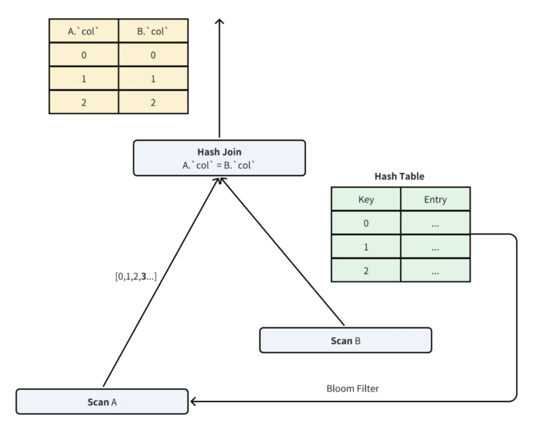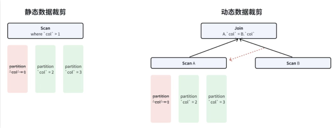 裁剪的关键是 “Probe 侧只读取可能匹配 Build 侧的数据”—— 即通过 Build 侧的 Join 列值,生成过滤谓词,提前排除 Probe 侧的不匹配行。