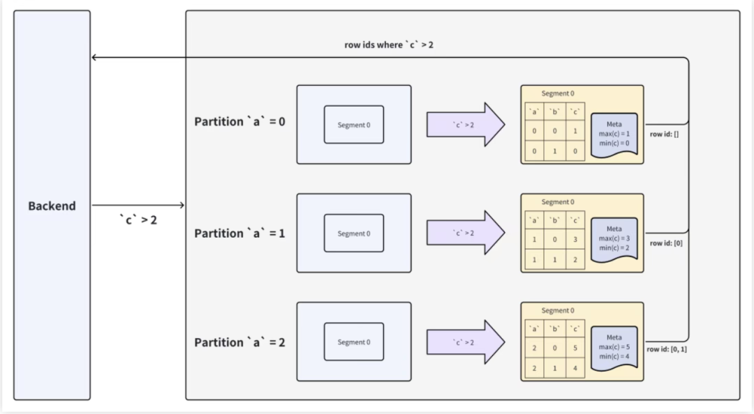 c列文件:2,直接跳过该文件;c值;c值(如[1,3,4,2,5])计算谓词,得到符合条件的行号(1,2,4);a,b)的行号 1,2,4 的数据,避免读取全量行。