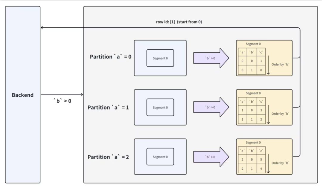 核心逻辑:Key 列(如b)在 Segment 内有序存储,通过谓词生成 Key 列的上下界,用二分查找确定需读取的行范围,跳过范围外的数据。