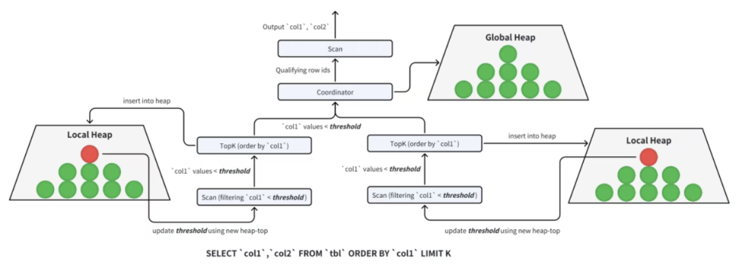例:10 个 BE 节点,K=10,局部裁剪后仅需传输 100 行数据到全局节点,全局排序 100 行即可,相比全量排序 10 亿行,开销可忽略不计。