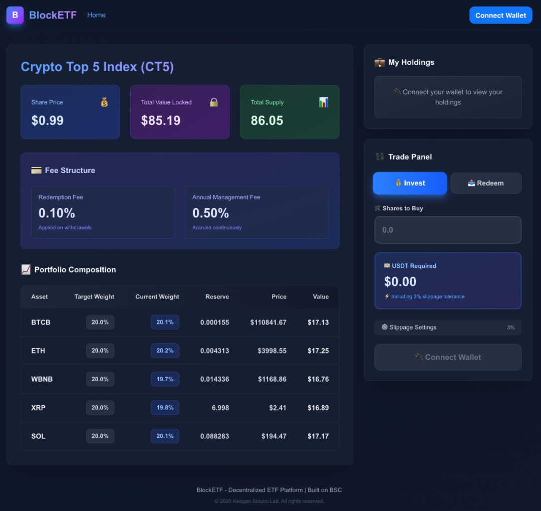 「Crypto Top 5 Index」则是我们目前上线的 第一个 ETF,代币符号为 CT5。它的底层资产组合包括:BTCB、ETH、WBNB、XRP、SOL。持有 CT5,其实就是间接持有了这 5 个核心资产。