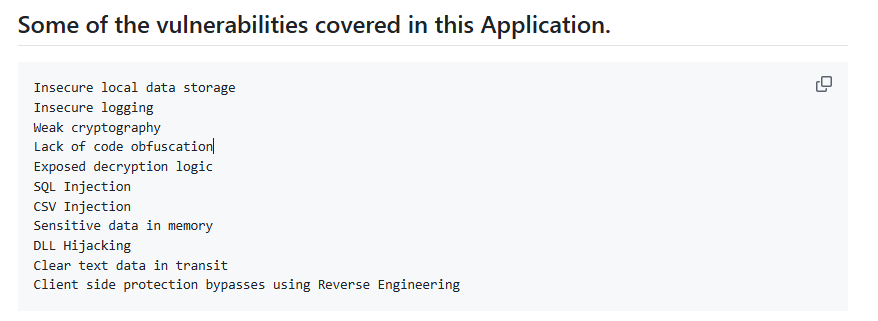 不安全的本地数据存储 不安全的日志记录 弱加密 缺少代码混淆 公开的解密逻辑 SQL 注入 CSV 注入 内存中的敏感数据 DLL 劫持 传输中的明文数据 使用逆向工程绕过客户端保护