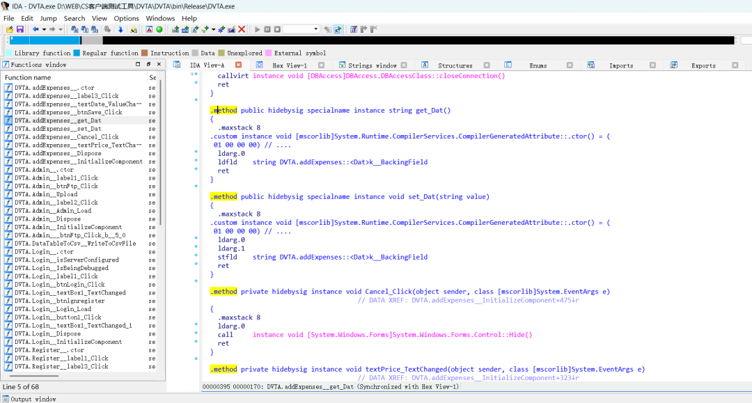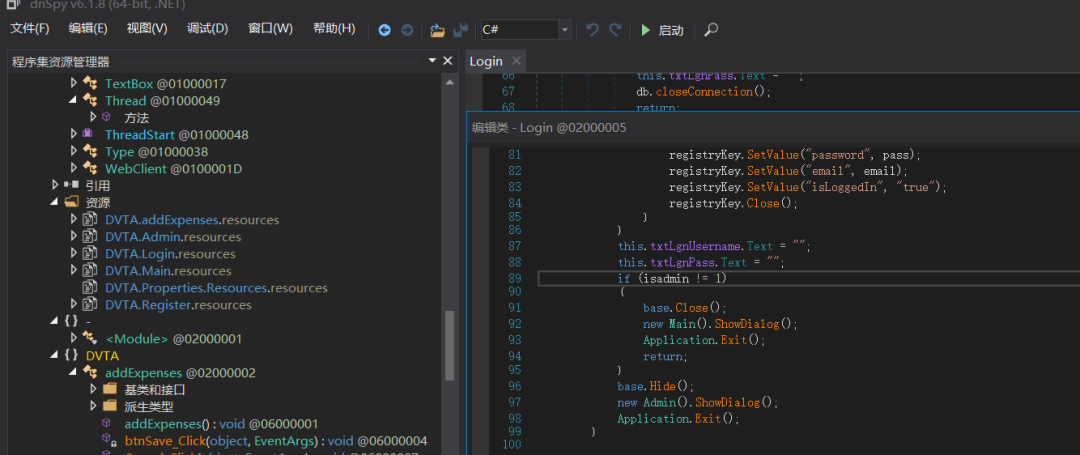 用dnSpy来反编译DVTA,修改Login类中的if判断语句if (isadmin != 1),从而让普通用户可以用管理员的身份登录