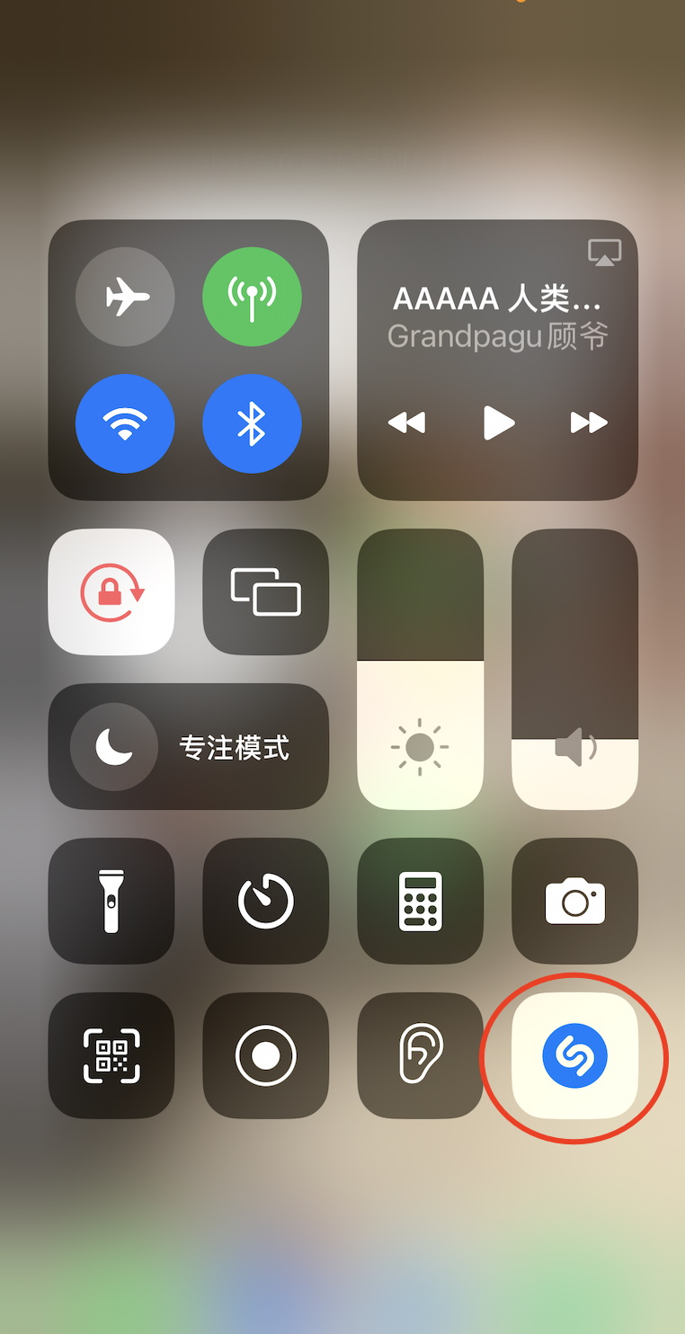 添加成功后,从屏幕右上方向斜下方滑动,就可以调出控制中心。点击红色圈选的 “音乐识别” 按钮,看到这个按钮变蓝后,iPhone 就自动开始帮你识别当前听到的音乐了。